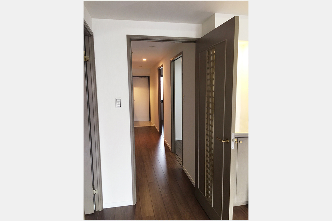玄関からリビングへと続く廊下も統一された空間へと変身。