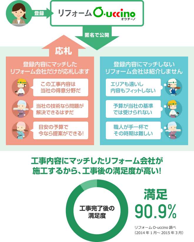 さて、信頼できるリフォーム会社であっても、いざ工事となるそこには得意な工事分野と、それほどでもない分野があります。得意な工事分野ほどリフォーム会社は費用面でより良い提案ができます。もちろん仕上がりにも自信があります。リフォームO-uccinoではまず皆様にリフォーム工事の内容を登録していただき(匿名可)、その内容と得意分野がマッチしたリフォーム会社を「応札」という形式で紹介しています。その結果、工事完了後のアンケートで実に90.9%もの方から「満足」「大満足」と回答をいただいています。